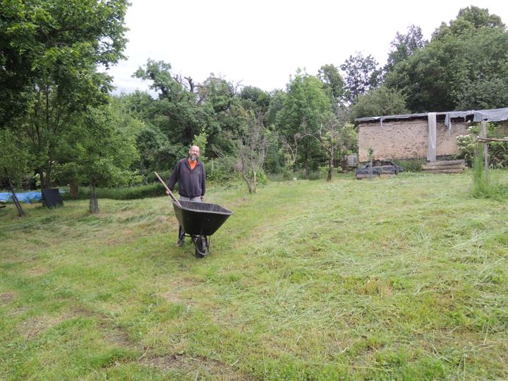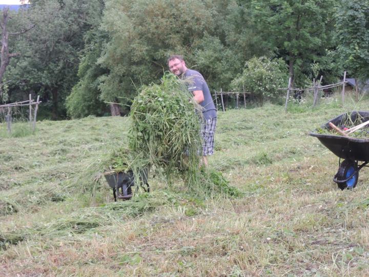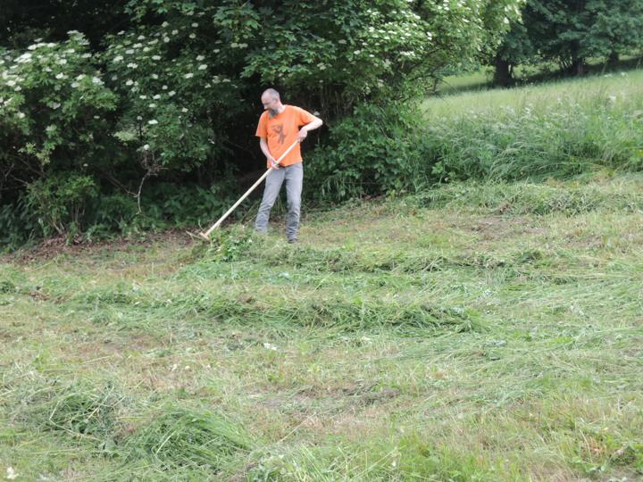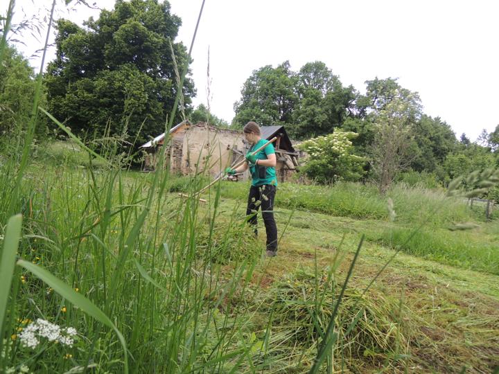 Sečení luk a svoz pokoseného materiálu na kompostovací hromady. Práce s kosou, hráběmi, vidlemi a kolečky.