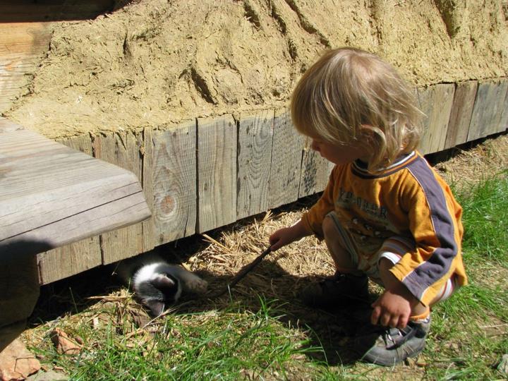 Různé práce v sadu, kosení a sušení sena, údržba lokality a staveb.