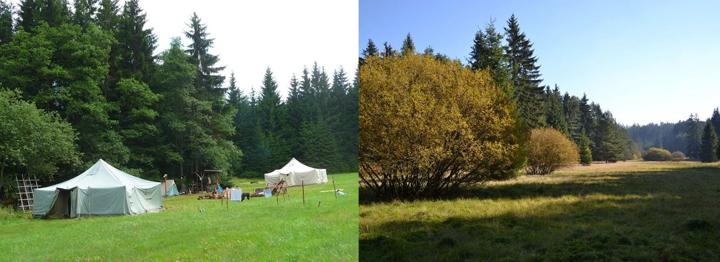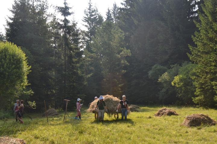 Kosení podmáčených luk v PR Opatovské zákopy, hrabání a následný odnos biomasy na nosítkách