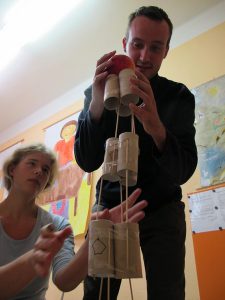 Keď už všetci nabrali nové sily, mohli sa stavbári pustiť do práce, materiálu mali k dispozícii dokonca viac, ako čo dostali v banke večer predtým. Tri stavebné firmy mali splniť rovnakú zákazku. Postaviť vysokú a pevnú vežu za pocitový časový limit. Z papierových ruličiek sa tentokrát stal stavebný materiál, spolu so špajľami a lepiacou páskou. Výška veží bola odmeraná motúzikom a nosnosť bola testovaná na trikrát, najprv malým jabĺčkom, potom jablkom a napokon obrovským jablčiskom. Zaujímavé bolo pozorovať originalitu konštrukčných riešení jednotlivých stavieb, každá stavebná firma mala skrátka svoj jedinečný stavebný postup.