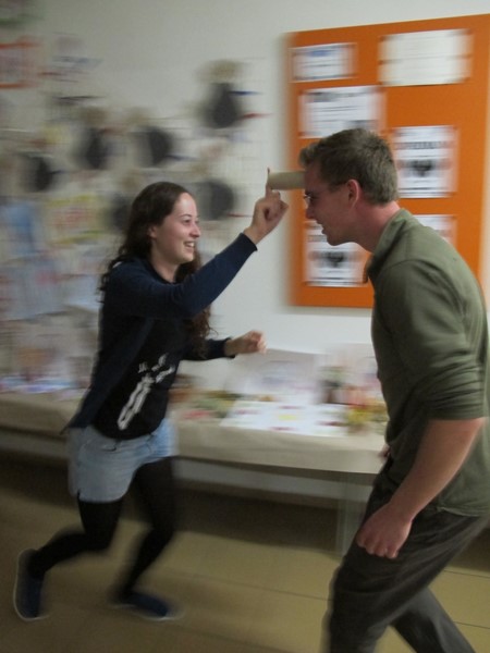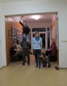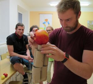 Onedlho sa začala úvodná hra, ktorej cieľom bolo vo dvojiciach a neskôr aj v trojiciach použitím rôznych vylosovaných častí tiel preniesť ruličku toaletného papiera tam a späť po chodbe miestnej školy, v ktorej sme boli ubytovaní. Na ukazovákoch sa prenášalo dobre, ale kombinácie, ako čelo jedného a koleno druhého člena tímu, nám dali zabrať.