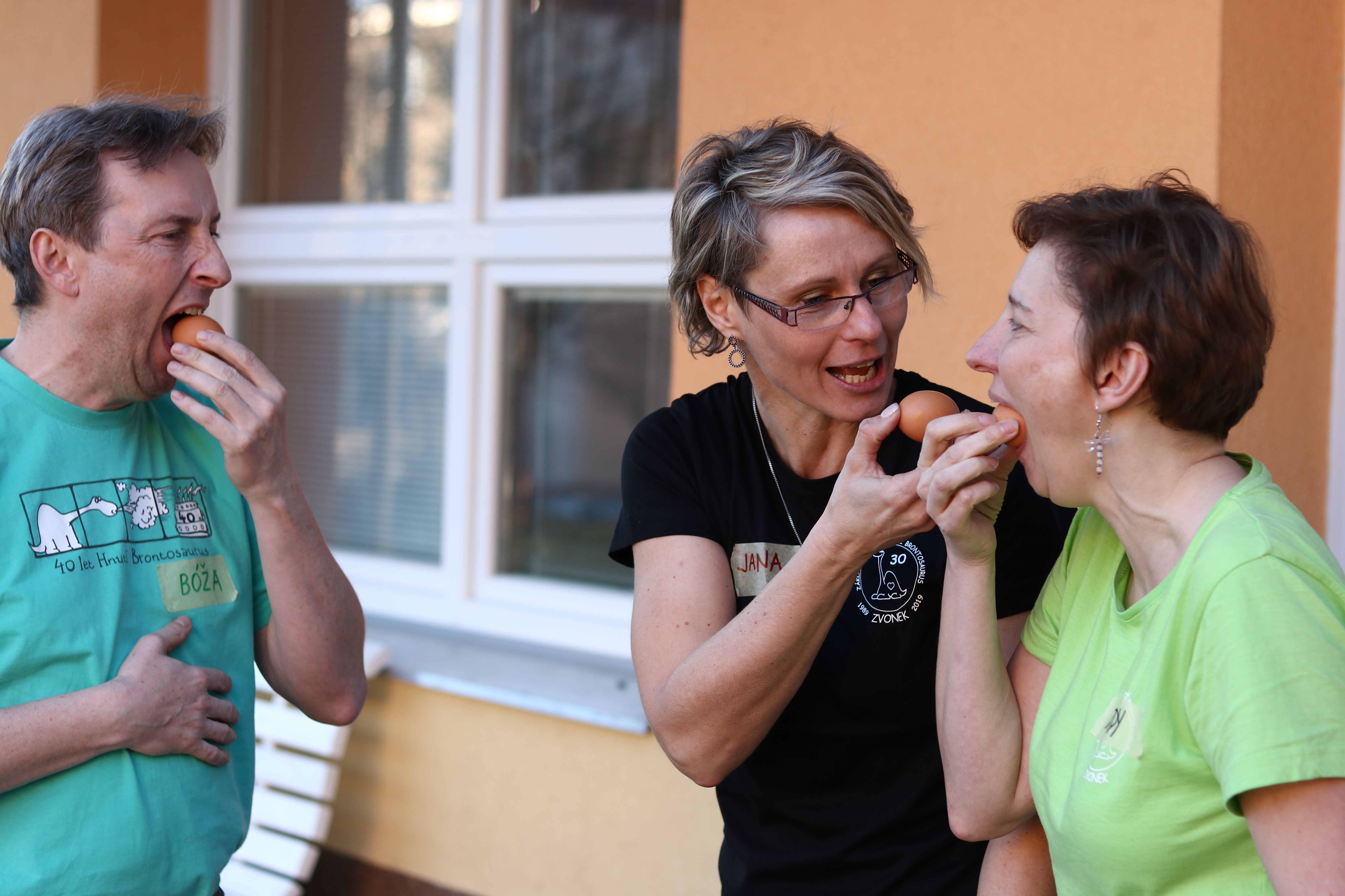 Na místo jsme se začali sjíždět už od čtvrtka (nejvěrnější a nejvytrvalejší z nás 😊) a v pátek to vypuklo naplno. Program se nesl v duchu loupežnickém, plnili jsme roztodivné úkoly fyzické i intelektuální zdatnosti. Být loupežníkem totiž není jen tak. Navíc loupežníkem o Velikonocích. Takže nás samozřejmě čekaly úkoly, u nichž plato vajíček bylo nezbytnou rekvizitou, jakož i každoroční soutěž o duhovou kuličku (tu vyhrál Jura). Za zmínku rozhodně stojí promyšlené dary, zejména specializované číslo časopisu ABC s ústředním hrdinou Jirkou Gazárkem. Nejedna slza se zaleskla v oku obdarovaného.